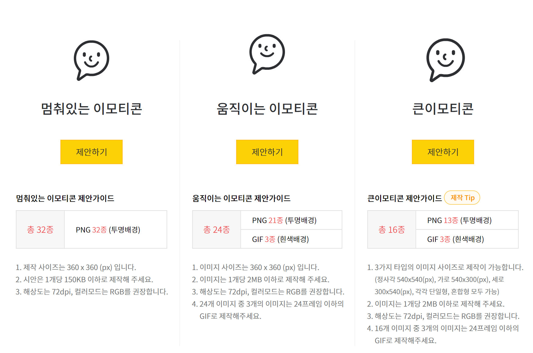 카카오톡 이모티콘은 멈춰 있는 이모티콘, 움직이는 이모티콘, 큰 이모티콘 이렇게 3종류로 심사가 진행됩니다.