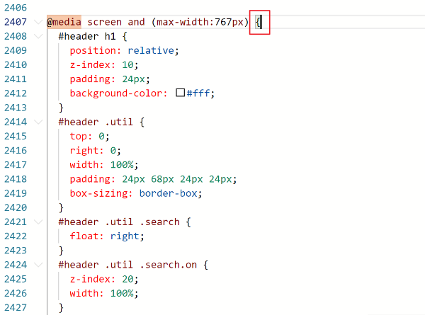 CSS 창에서 Ctrl + f를 눌러 media screen을 찾아보세요.