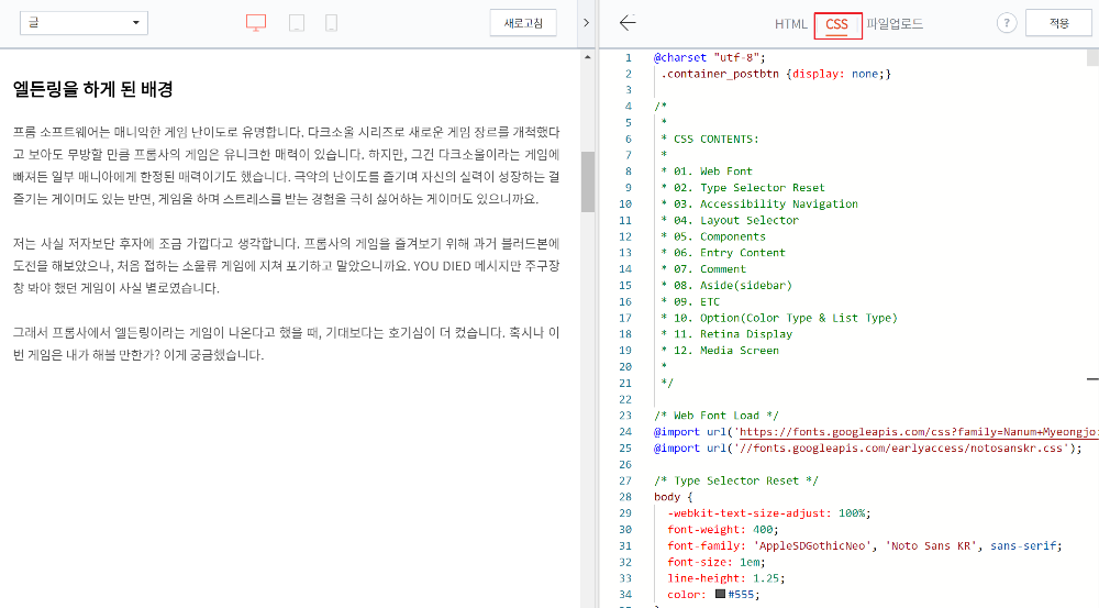 다 아시겠지만, CSS를 변경하면 적용 버튼을 클릭해야 변경 내용이 반영됩니다.