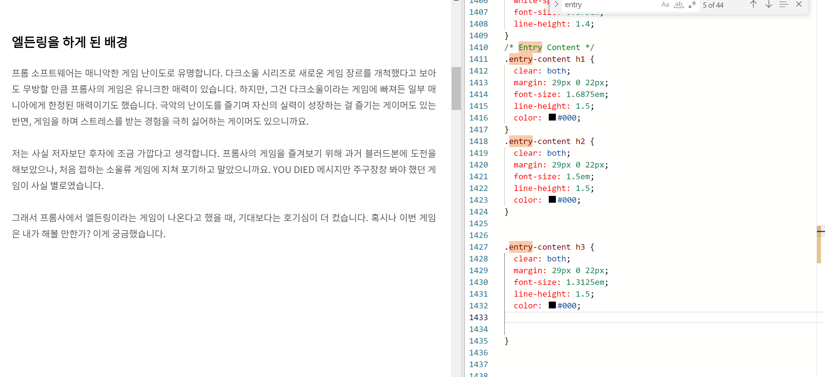 CSS 편집 창에서 Ctrl + f 키를 눌러 entry_content 를 검색해 보세요.